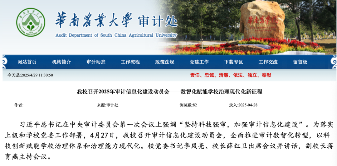 在數字化轉型浪潮中,高校治理能力提升成為“雙一流”建設的關鍵突破口,而審計信息化建設則是高?!半p一流”建設的堅實保障。以廣東省教育廳《關于認真做好2025年教育審計工作的通知》相關要求為背景,華南農業大學審計處積極調研并開展審計信息化建設,與我司「北京審友數治科技有限公司」簽約合作,計劃構建審計管理、在線作業、數據分析、整改跟蹤、工程審計、遠程協同、決策支持等模塊,助力華南農大打造高校審計信息化標桿。